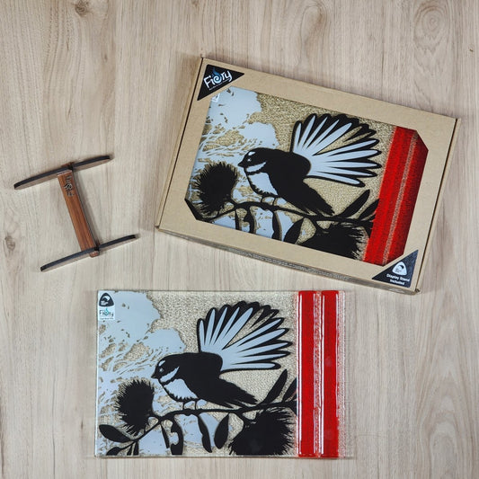 NZ Made Glass Platter/Plate - Fantail Piwakawaka/Pohutukawa - Blk/Wht/Red w/stand