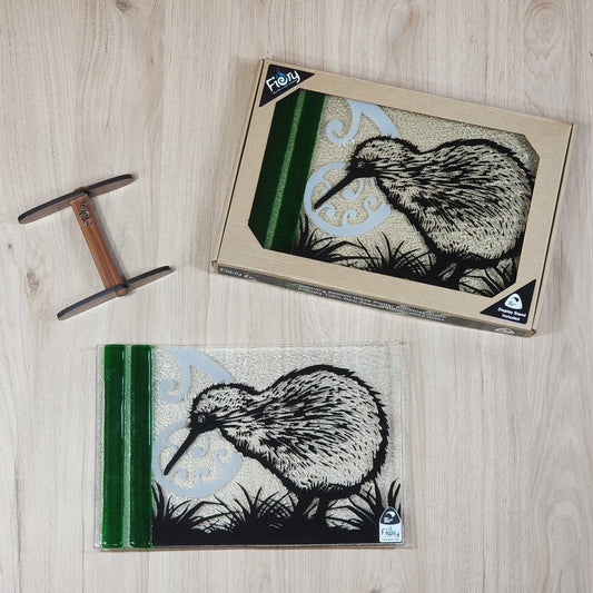 NZ Made Glass Platter/Plate - Native Kiwi/Ponga - Blk/Wht/Green w/stand