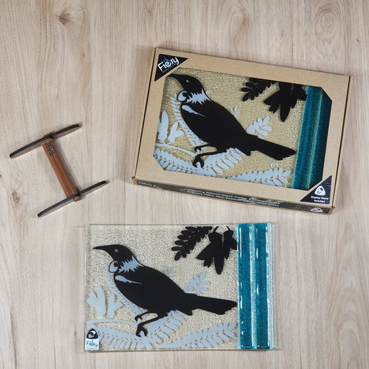 NZ Made Glass Platter/Plate - Native Tui/Kowhai - Blk/Wht/Aqua w/stand