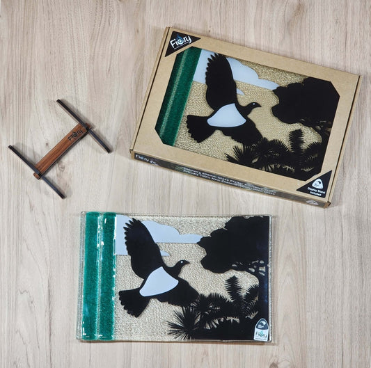 NZ Made Glass Platter/Plate - Native Wood Pigeon Kereru/Kauri - Blk/Wht/Teal w/stand
