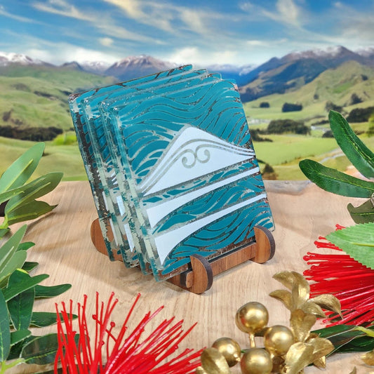 NZ Made Glass Coasters Te Maunga - Teal/Pearl - 4Pk w/stand
