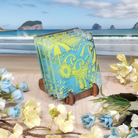 NZ Made Glass Coasters Kiwi Summer - Blue/Yellow - 4pk w/stand