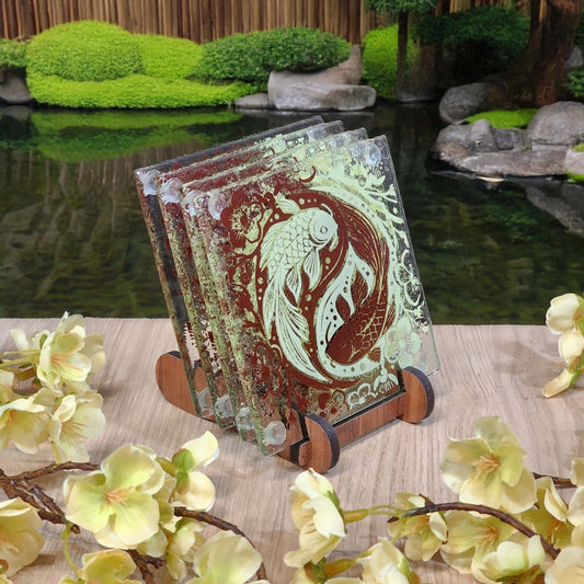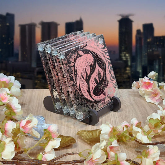 NZ Made Glass Coasters Koi Balance - Pink/Blk - 4Pk w/stand