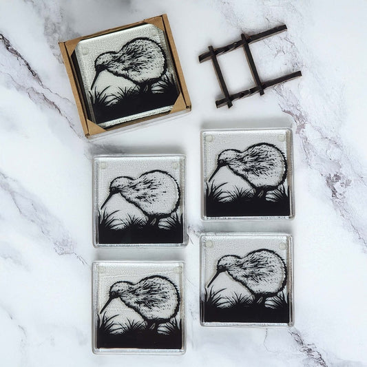 NZ Made Glass Coasters Kiwi - 4Pk w/stand