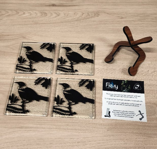 NZ Made Glass Coasters Tui - Blk - 4Pk w/stand